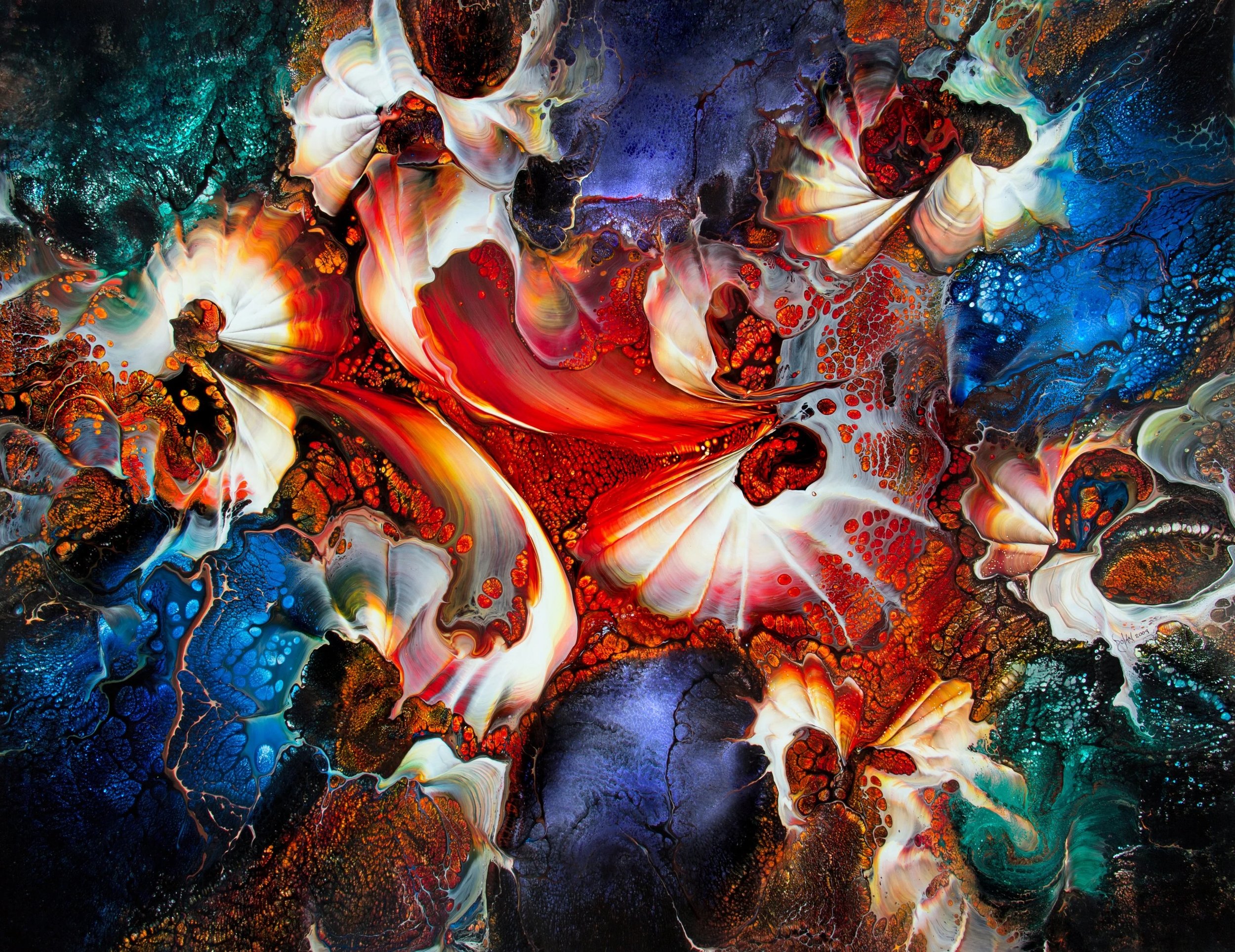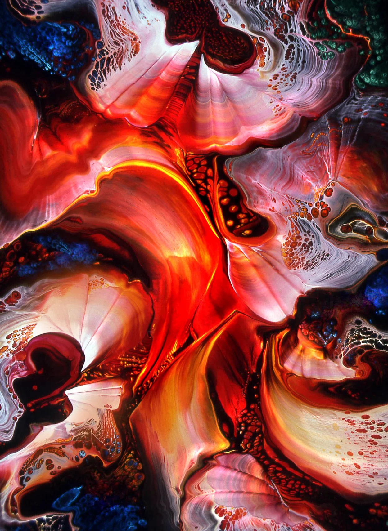 The one of a kind paintings were done on the surface of ¼ inch tempered board which is extremely durable and non-porous. The raw pigments David used to make the medium are the same as those used to make conventional oil paint, and have the same color-fast qualities. The difference is in the binders and solvents he used. At no time were non-compatible chemical reactions used to achieve special effects. This was to assure the permanence and longevity of the paintings. Clear topcoats that can yellow and discolor over time were never used. Gloss enhancer was used within the pigments to achieve the desired intensity. The complex layering process yields a unique depth of color that transforms into three dimensional effects that are exceptionally impacted by changes in lighting.